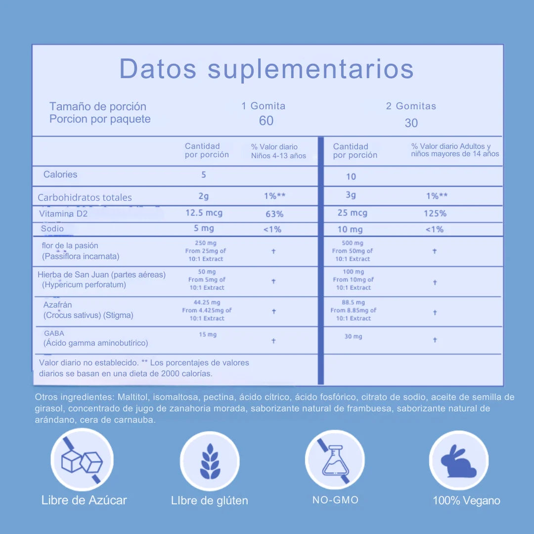 Nuestra fórmula única combina azafrán, pasiflora, hierba de San Juan, GABA y vitamina D2, ingredientes respaldados por estudios científicos. A diferencia de otros productos, está diseñada específicamente para el bienestar emocional y la concentración de los niños.